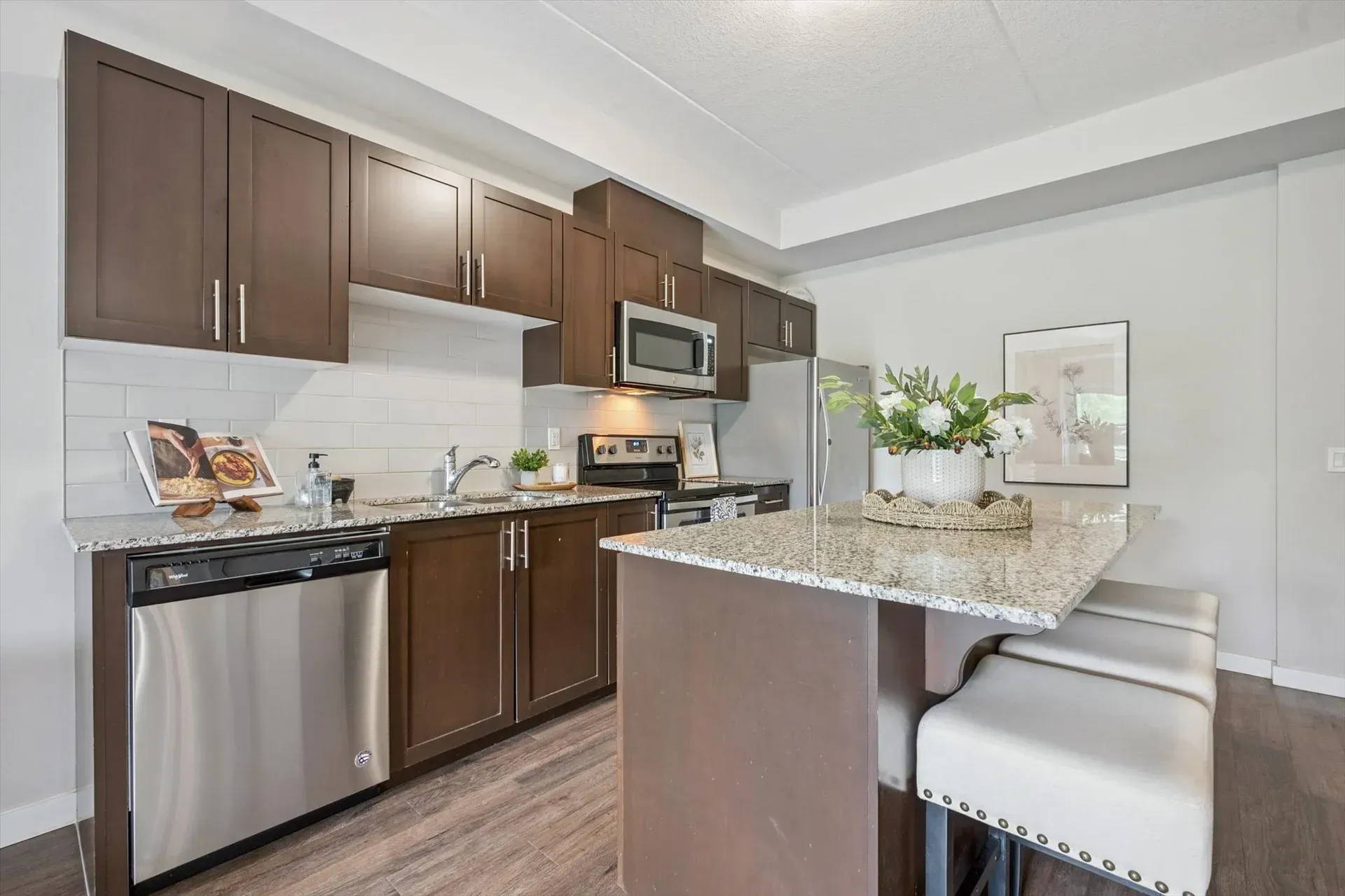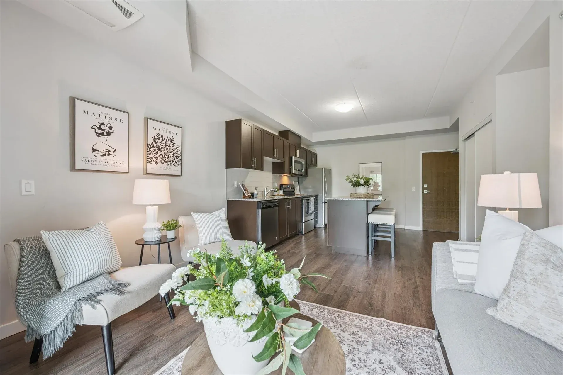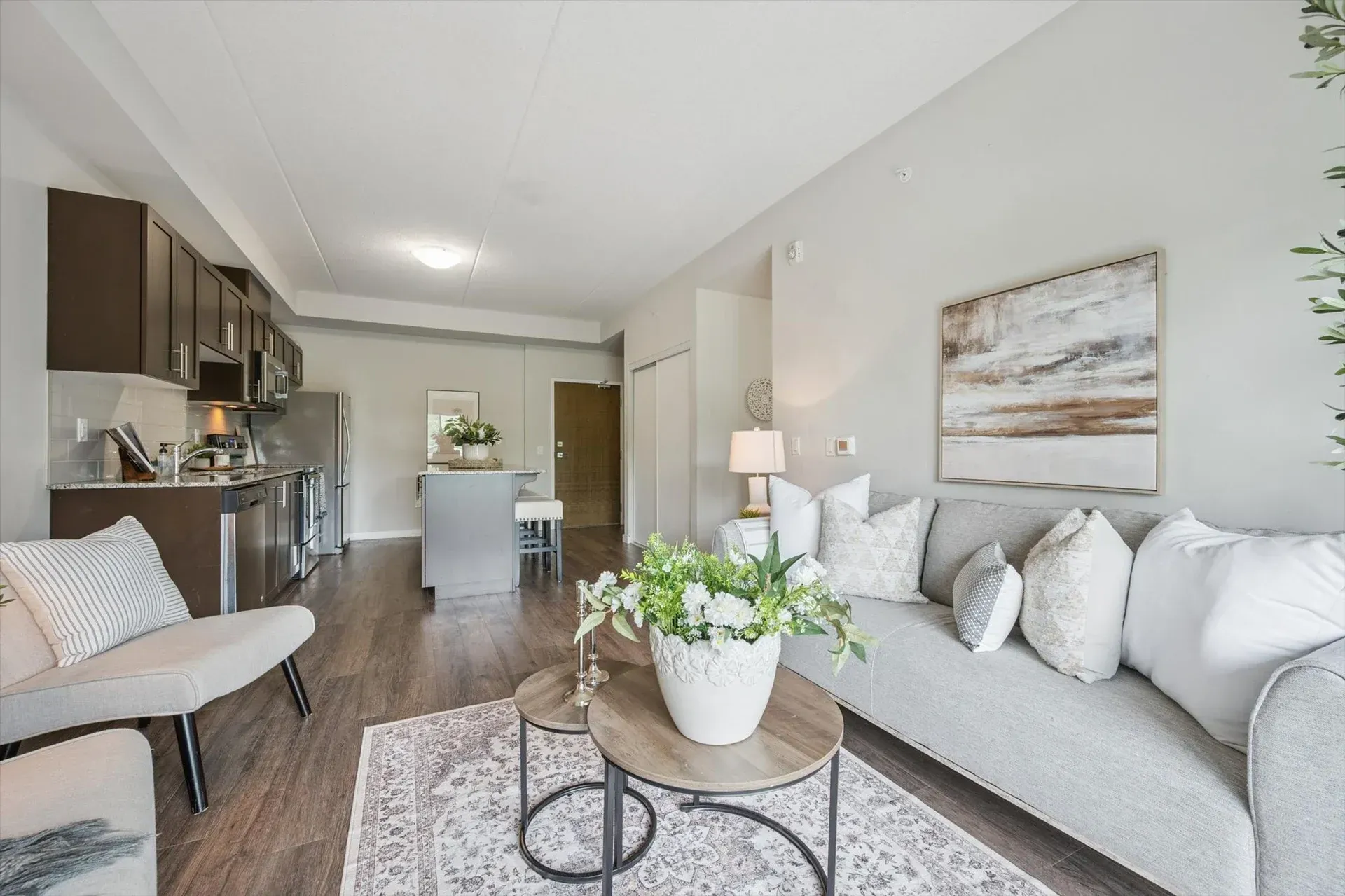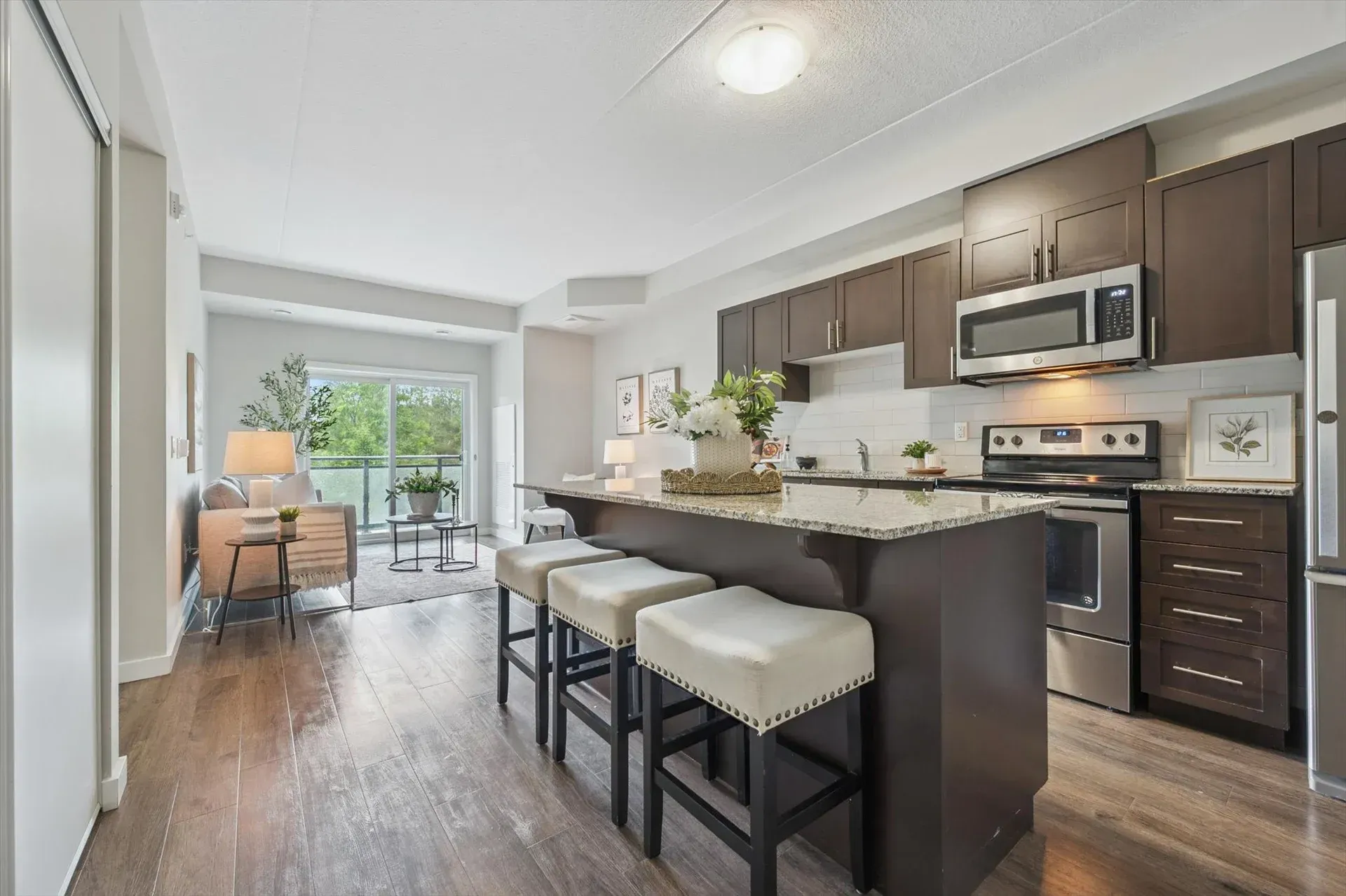 One of the largest floor plans in the building, this thoughtfully designed unit features an open-concept living space with sleek hard-surface flooring, granite countertops, and stainless steel appliances. The primary bedroom includes its own 3-piece ensuite with a walk-in glass shower, while the second bedroom and full guest bath provide added flexibility. With a dedicated parking spot, private storage locker, and easy access to shopping, dining, fitness centres, transit routes, and the University of Guelph, this home suits a wide range of lifestyles.