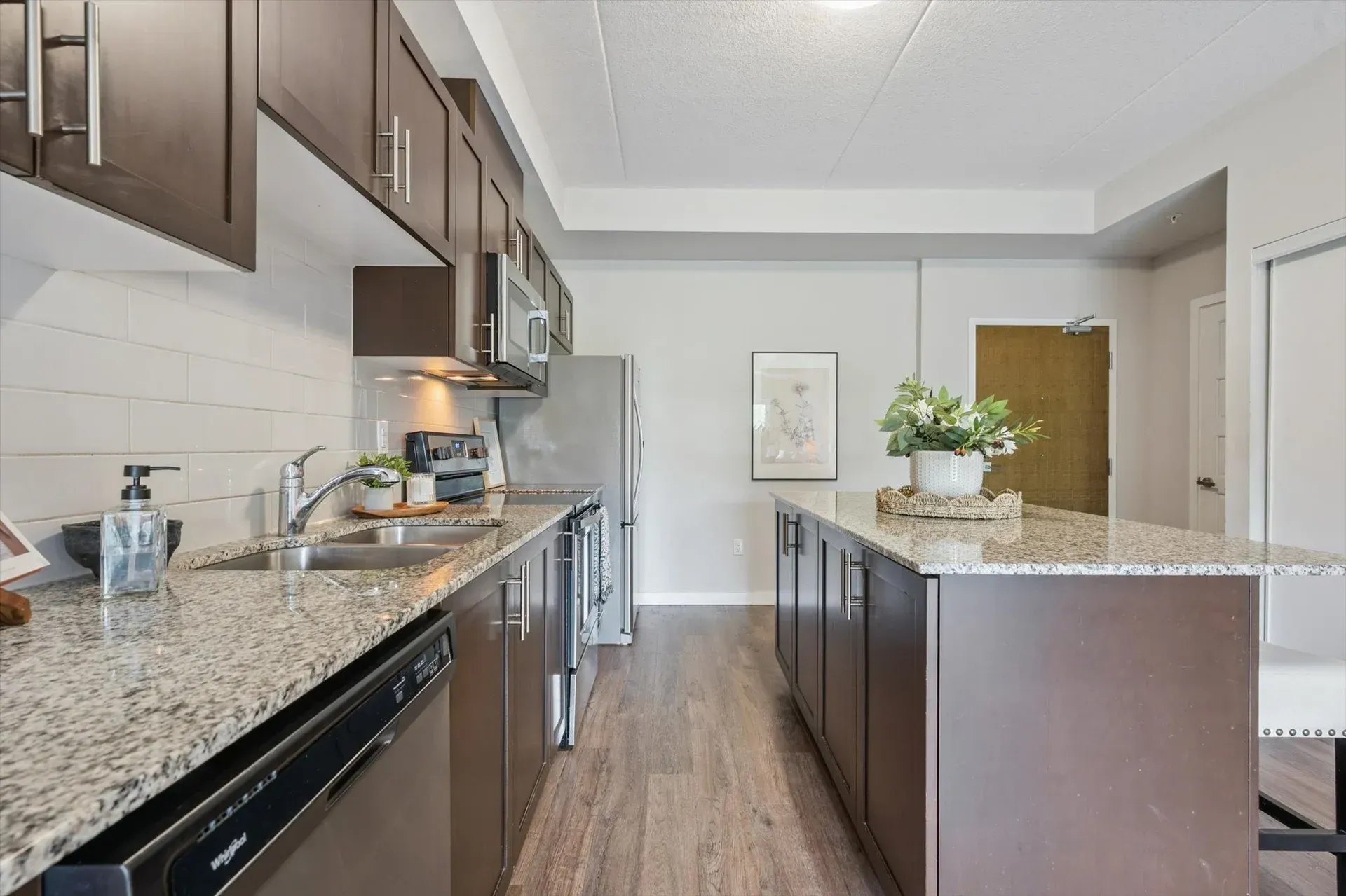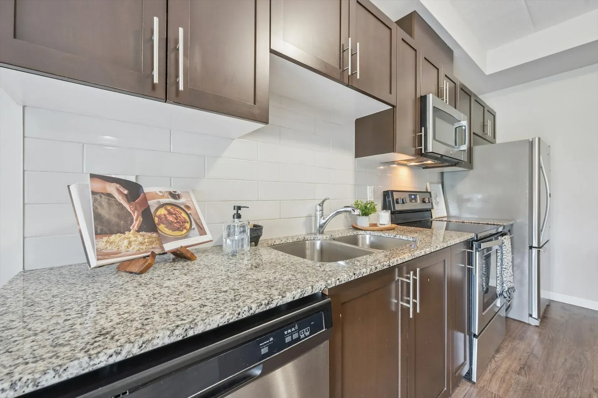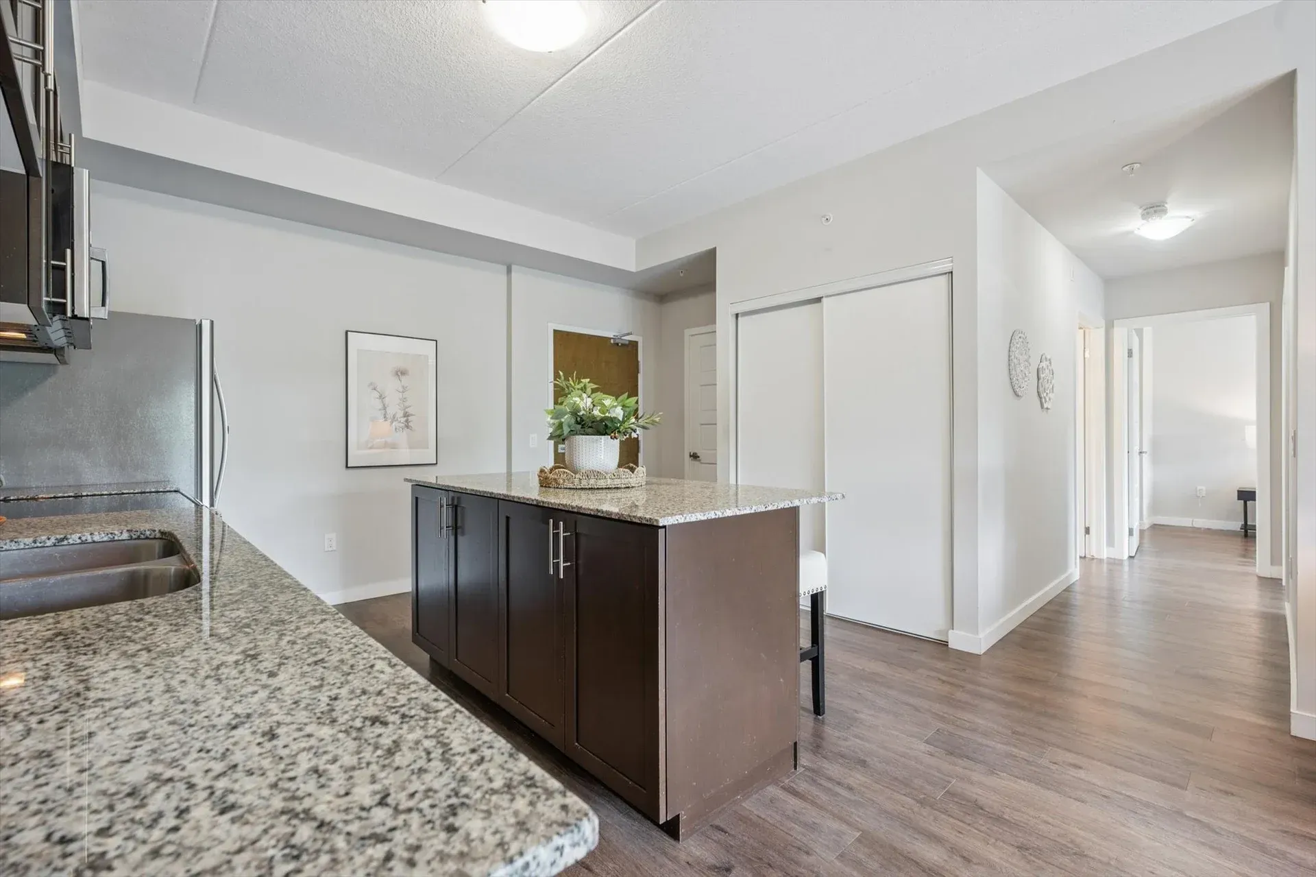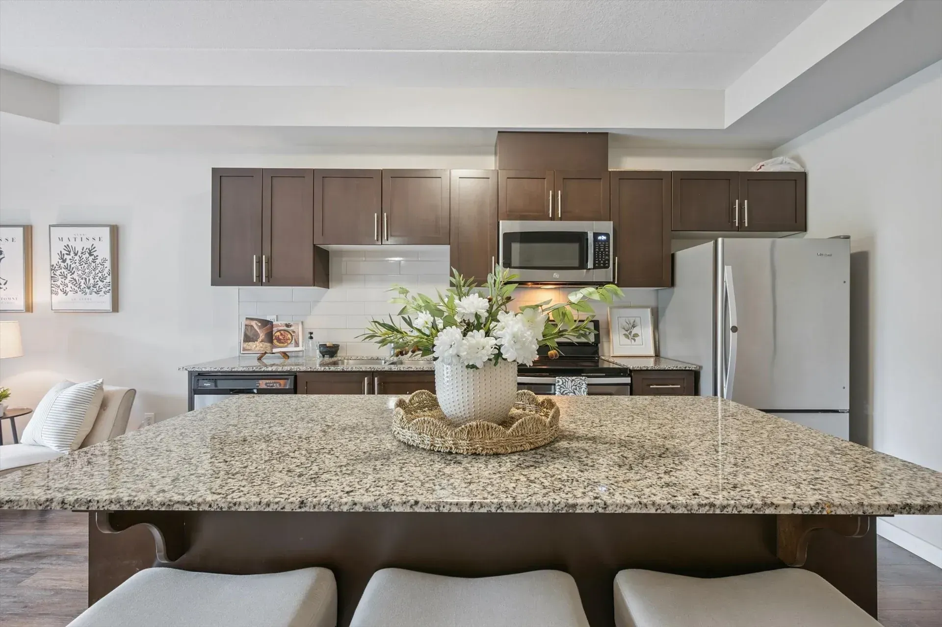 One of the largest floor plans in the building, this thoughtfully designed unit features an open-concept living space with sleek hard-surface flooring, granite countertops, and stainless steel appliances. The primary bedroom includes its own 3-piece ensuite with a walk-in glass shower, while the second bedroom and full guest bath provide added flexibility. With a dedicated parking spot, private storage locker, and easy access to shopping, dining, fitness centres, transit routes, and the University of Guelph, this home suits a wide range of lifestyles.