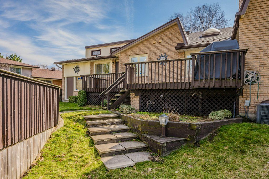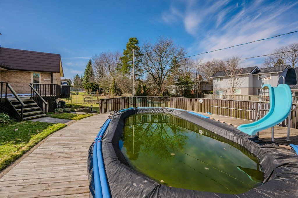 The property includes two generously sized bedrooms and a large primary bedroom with access to the main floor washroom. The kitchen features an eat-in area with views of the backyard. A separate entrance leads to a mudroom and basement, which includes another bedroom, office, washroom, and living areas. The garage offers additional loft storage space. Despite its amenities, the oversized backyard still maintains ample yard space for relaxation and entertainment, accommodating a massive deck, above-ground pool, and hot tub.