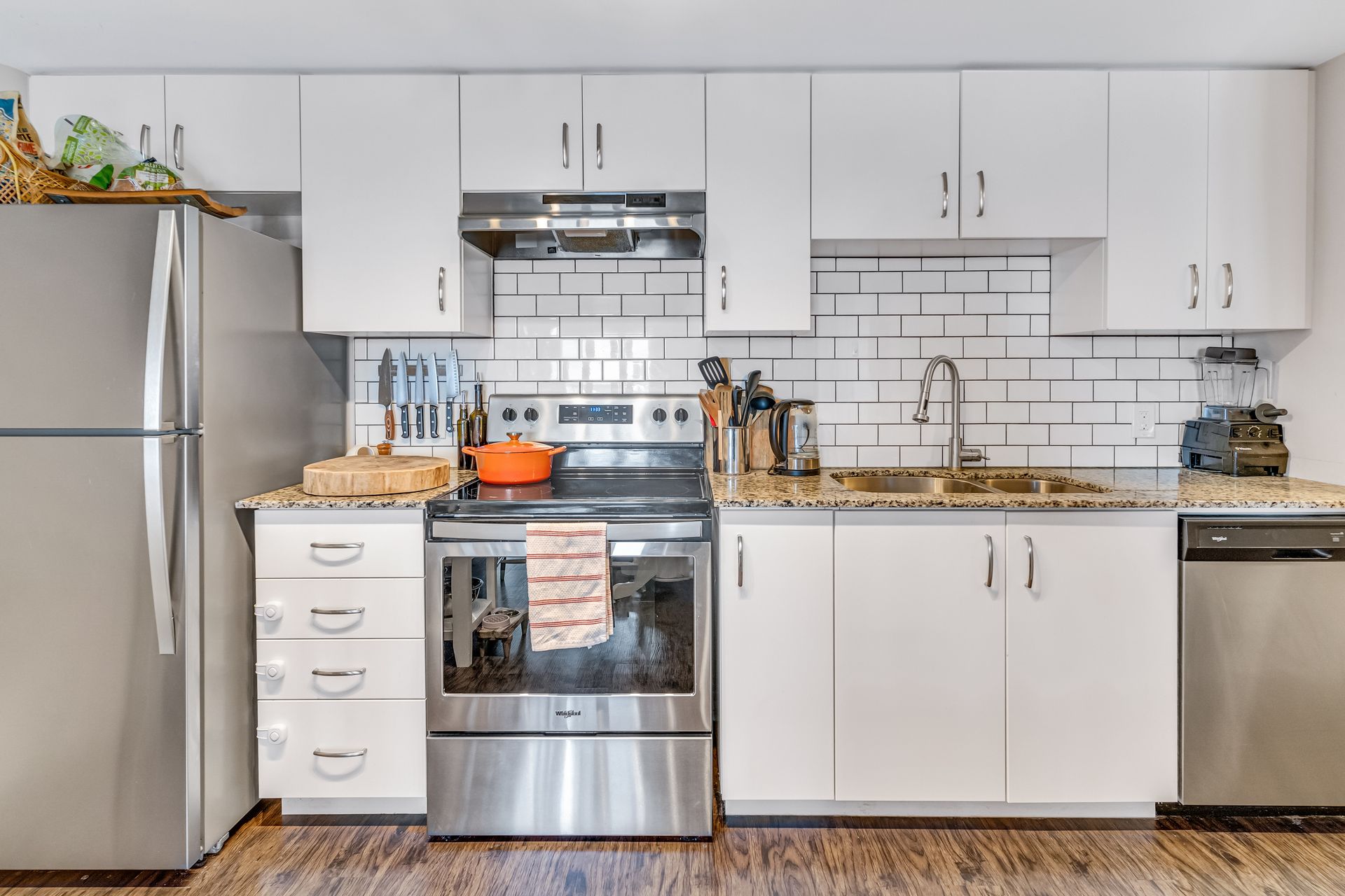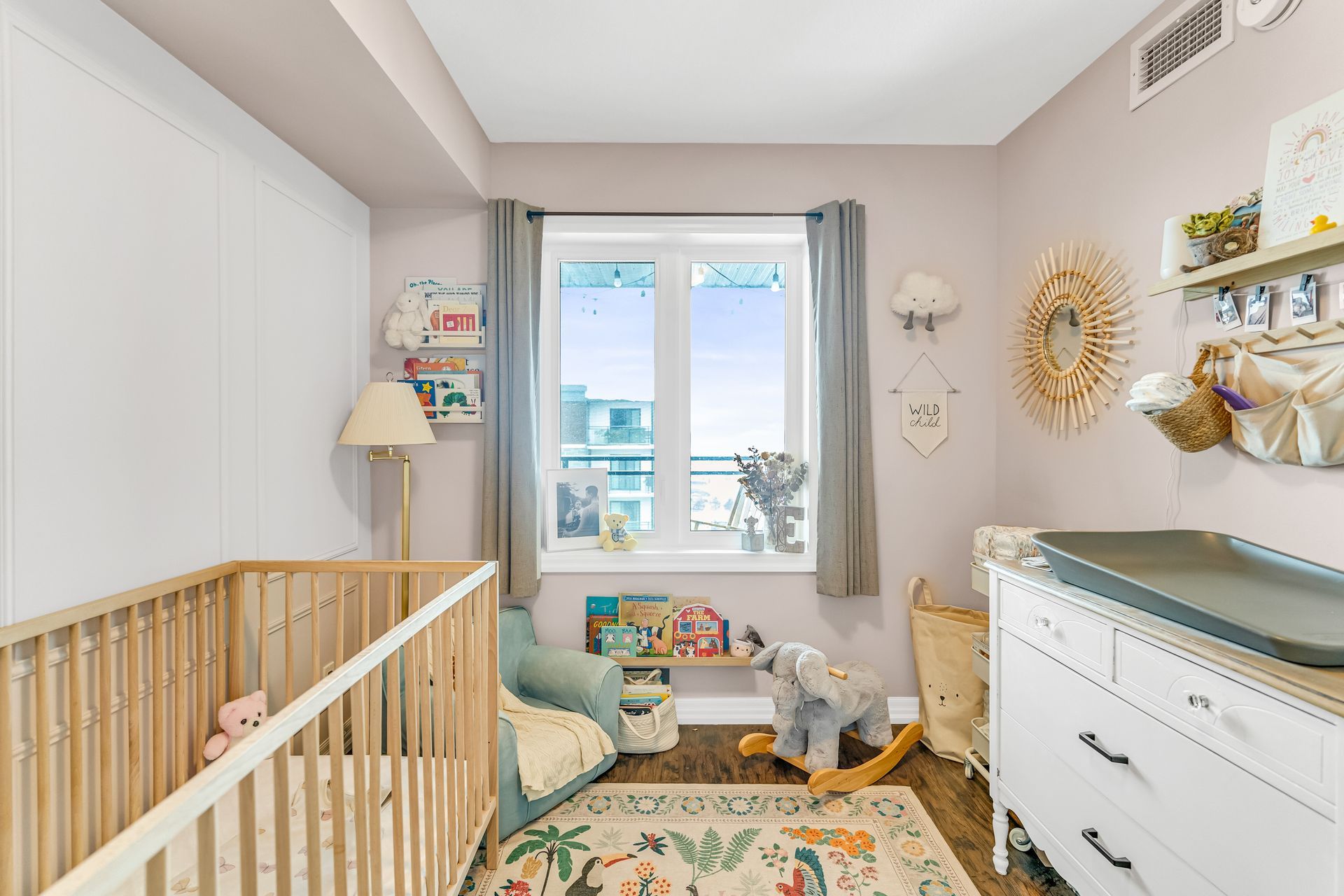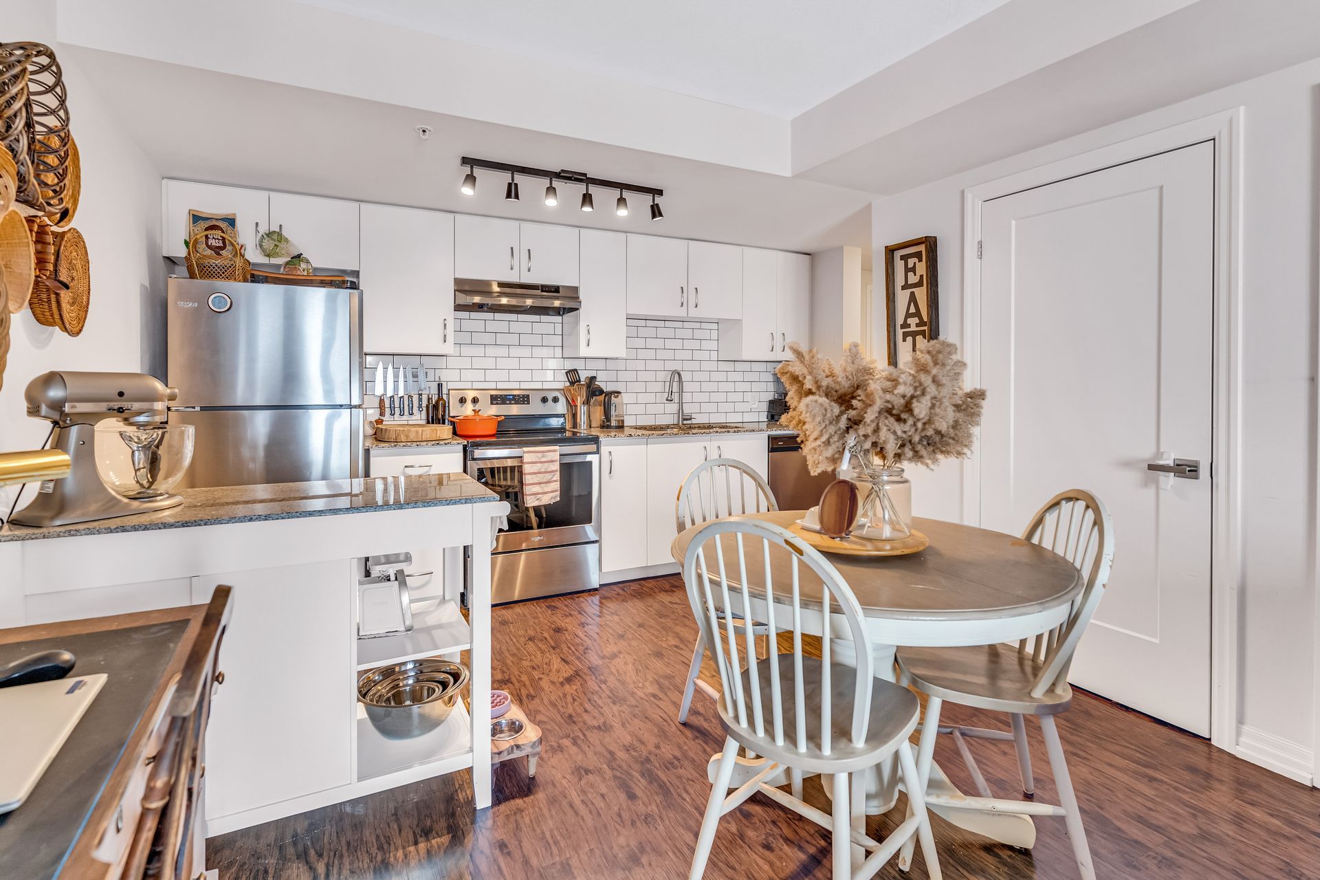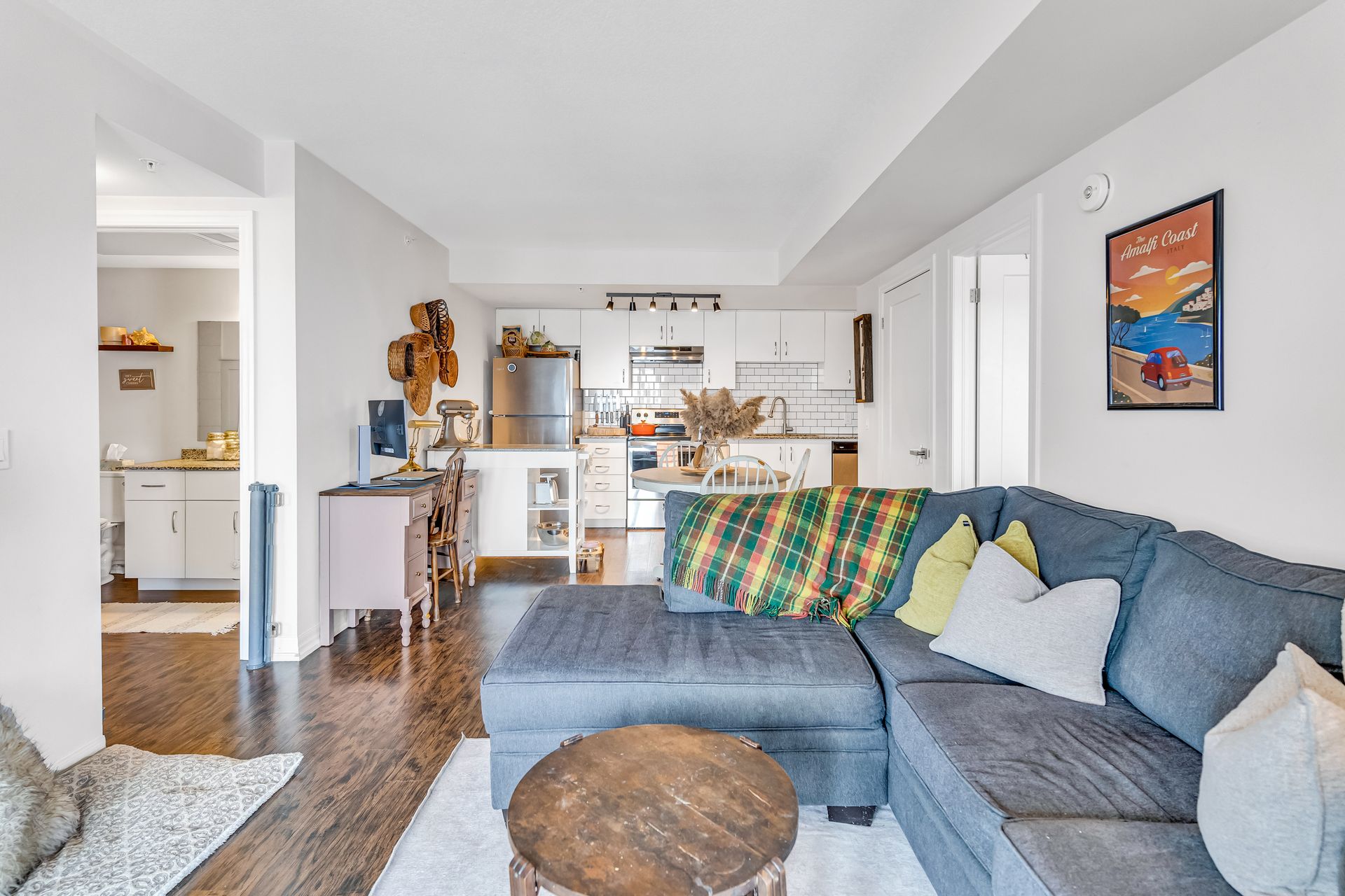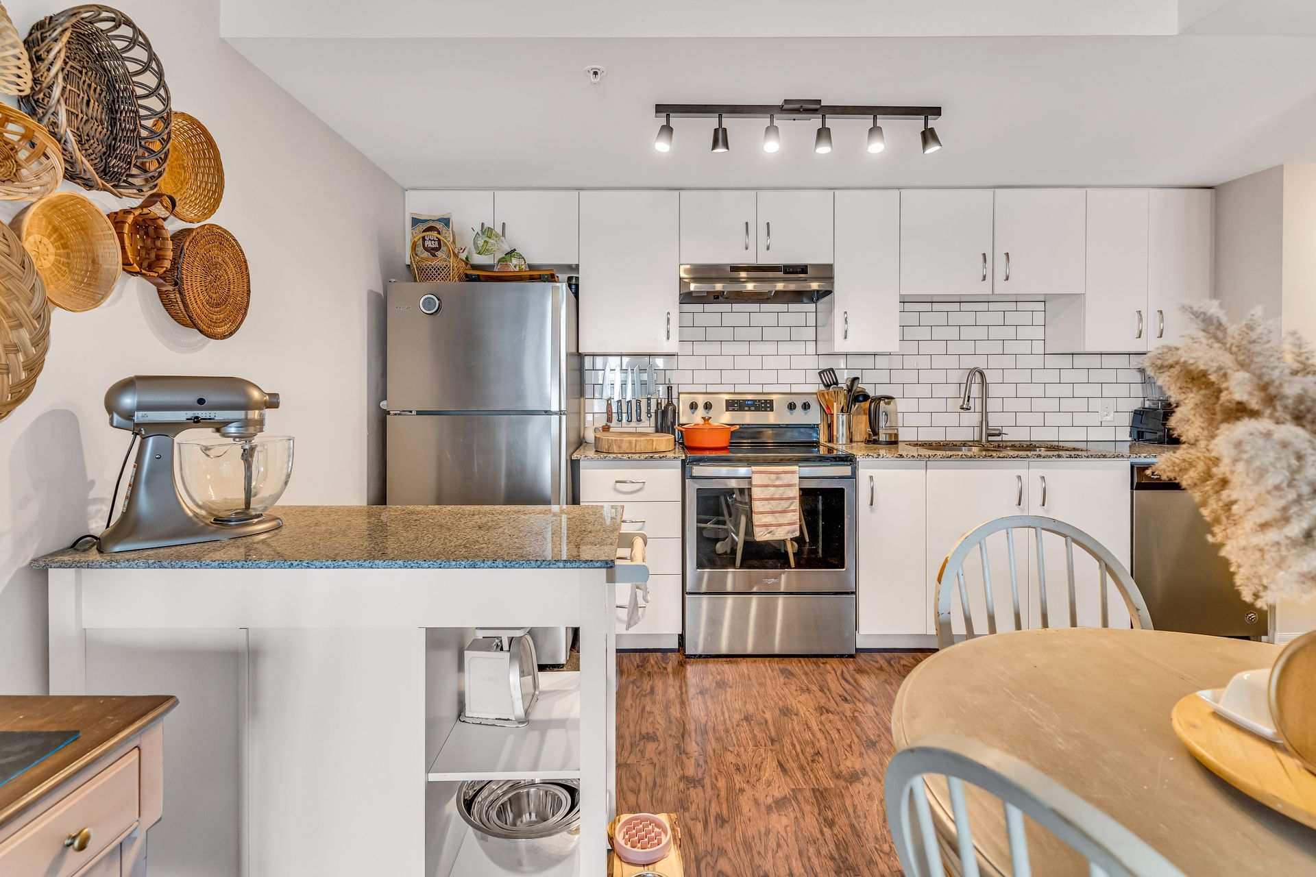 This bright and airy 2-bedroom, 1-bathroom unit features an open-concept layout with west-facing views, offering stunning sunsets and abundant natural light.The stylish modern kitchen boasts white cabinetry, stainless steel appliances, granite countertops, and space for both a kitchen table and an island. The spacious living room includes a custom-built electric fireplace, adding warmth and functionality as a media unit.