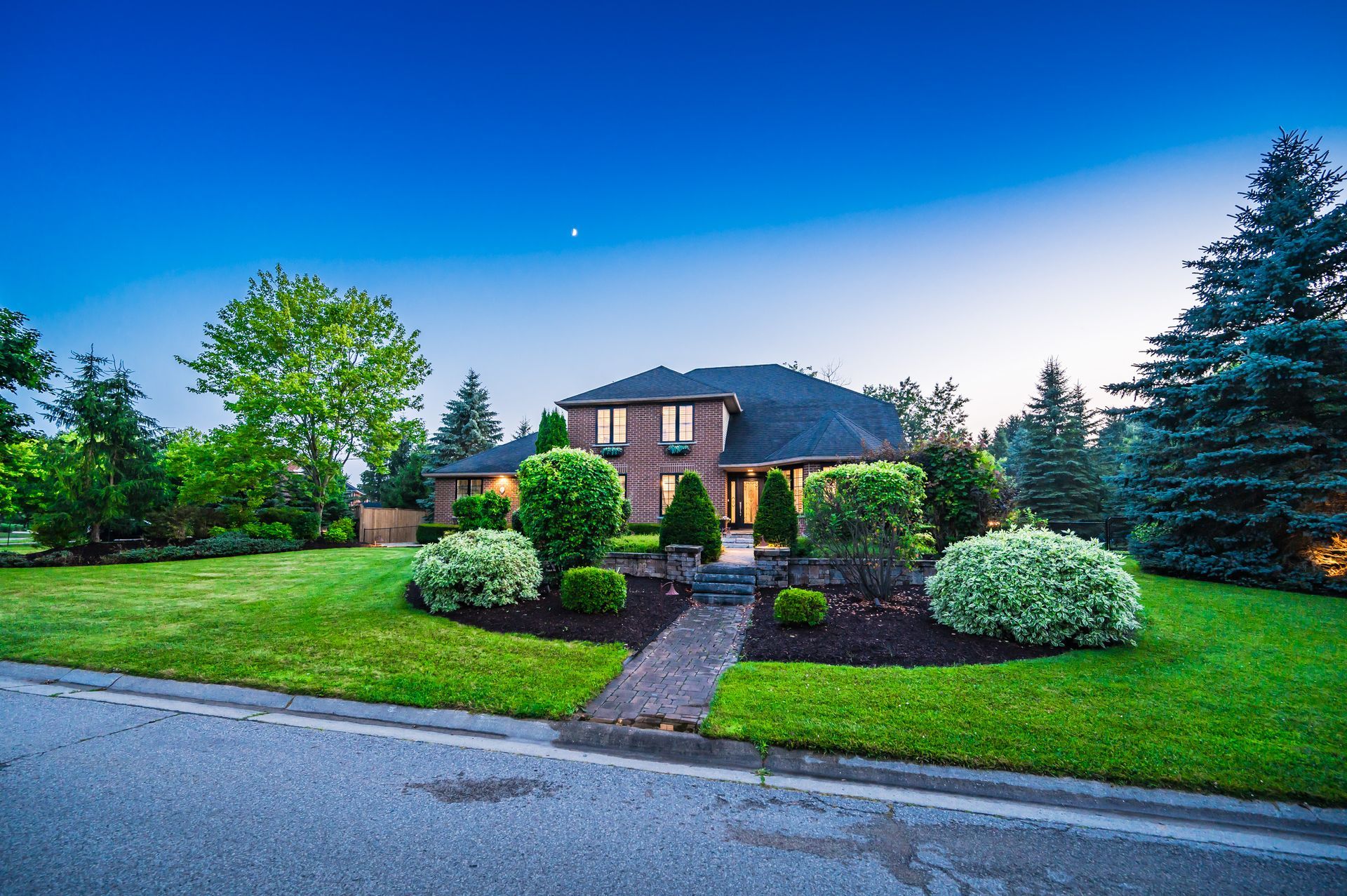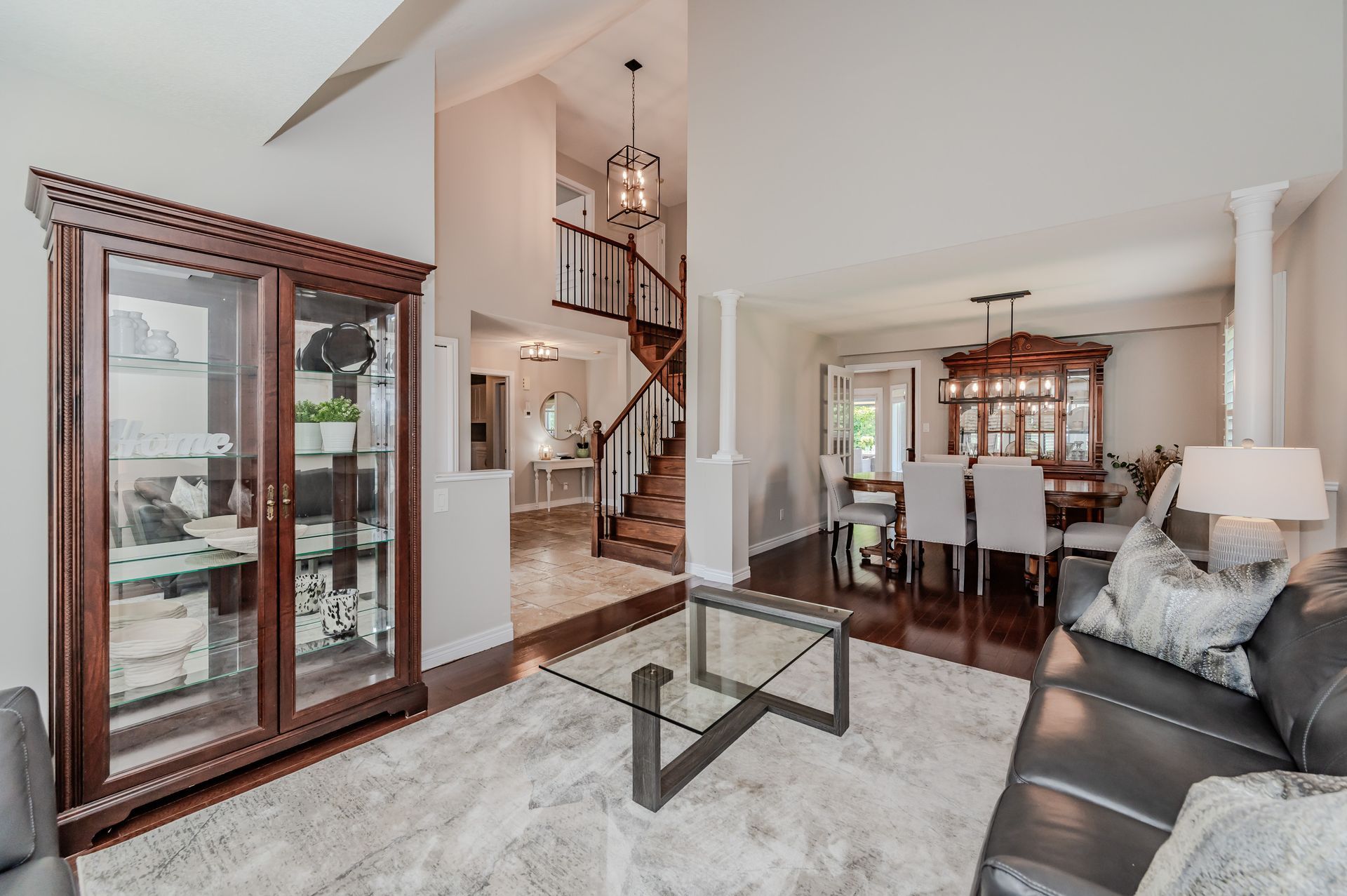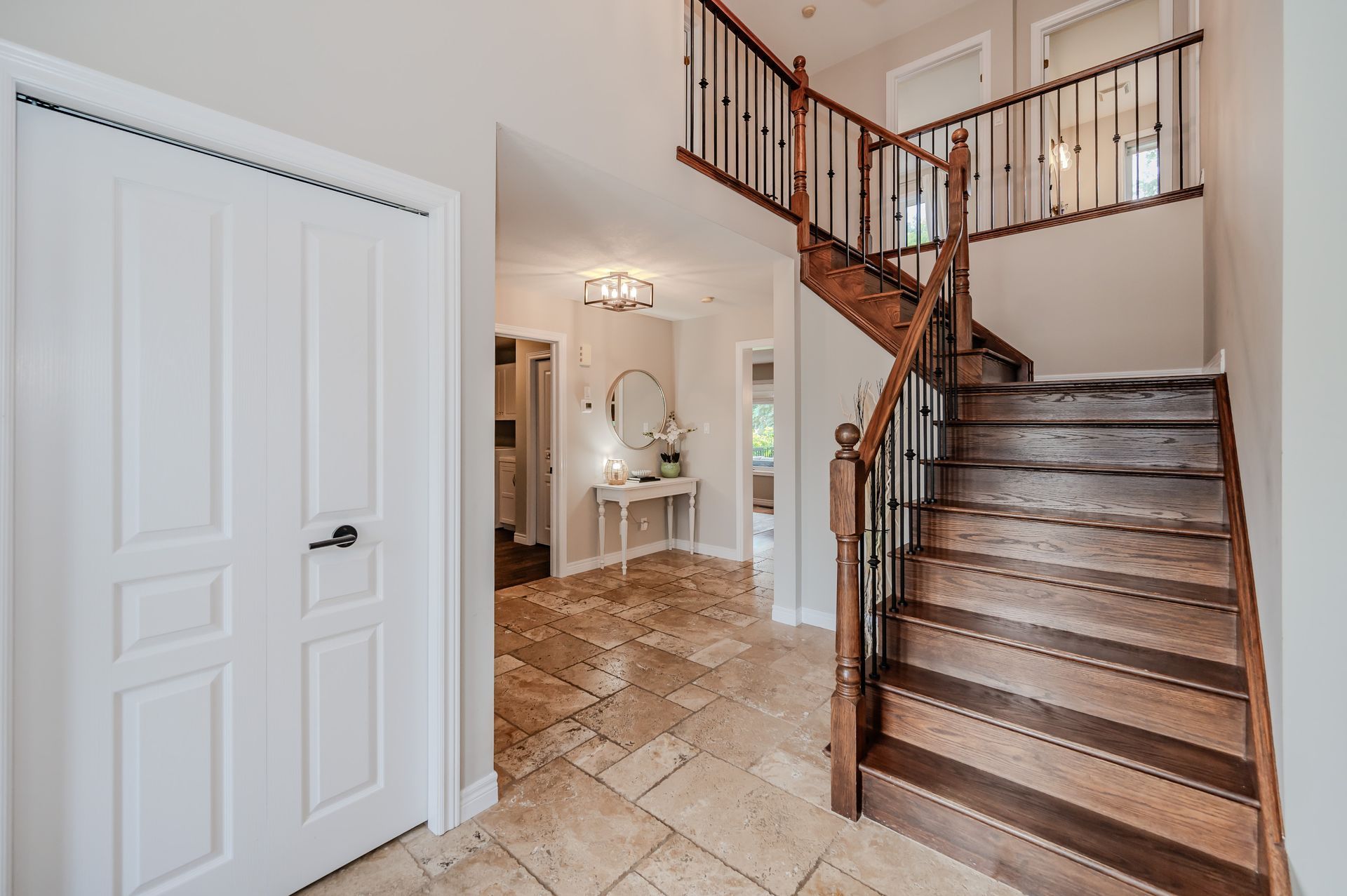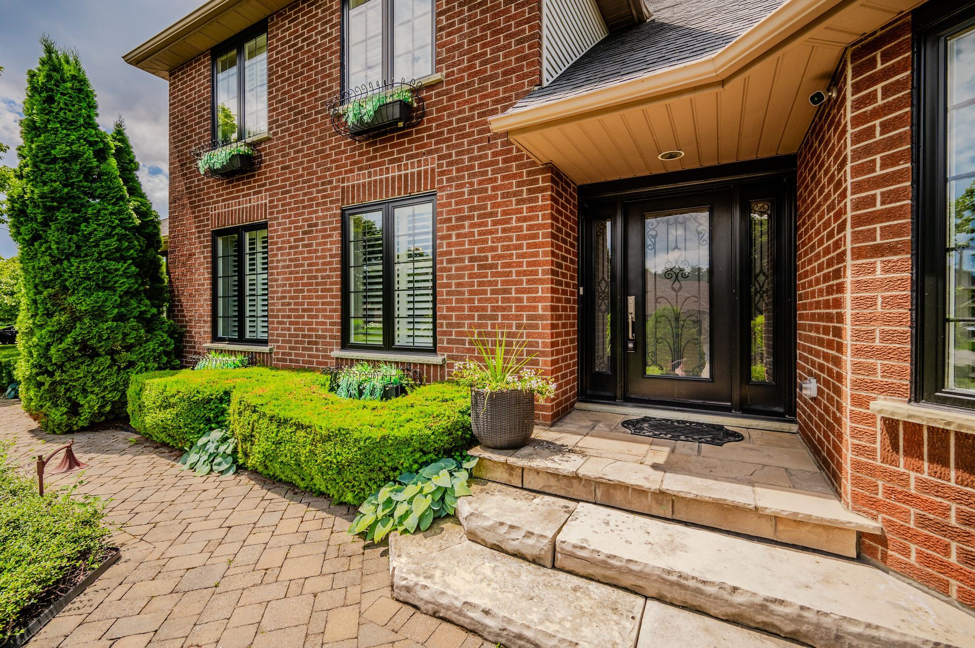 Step inside the all-brick home to find a spacious, light-filled foyer with vaulted ceilings. The main level includes a formal dining area, a cozy seating area, a mudroom with garage access, a home office, and a two-piece washroom. At the rear, enjoy a custom Barzotti kitchen with views of the lush backyard and a living room with a gas fireplace, creating a perfect blend of style and comfort.