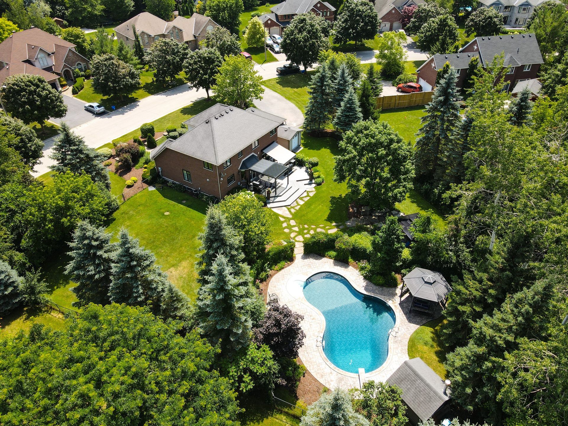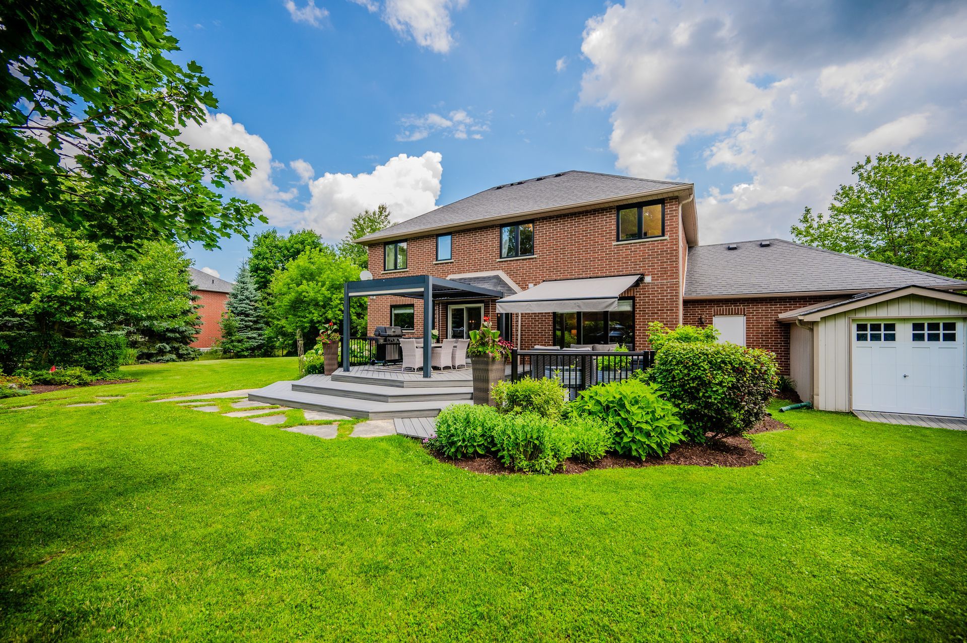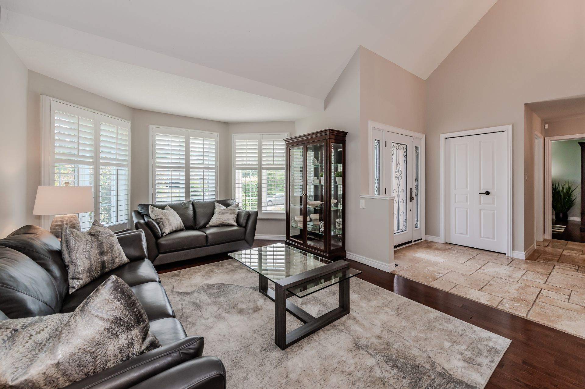 Step inside the all-brick home to find a spacious, light-filled foyer with vaulted ceilings. The main level includes a formal dining area, a cozy seating area, a mudroom with garage access, a home office, and a two-piece washroom. At the rear, enjoy a custom Barzotti kitchen with views of the lush backyard and a living room with a gas fireplace, creating a perfect blend of style and comfort.