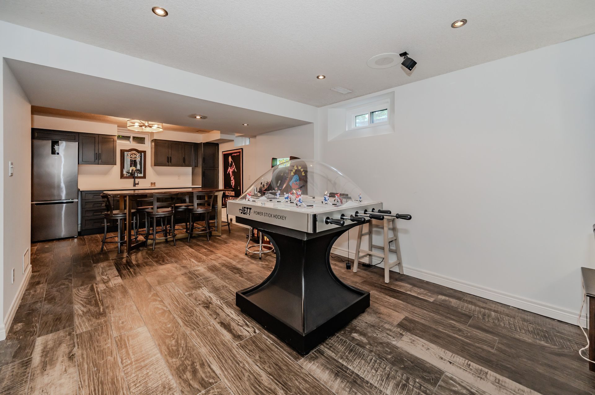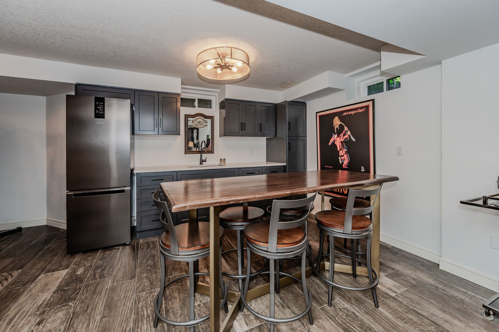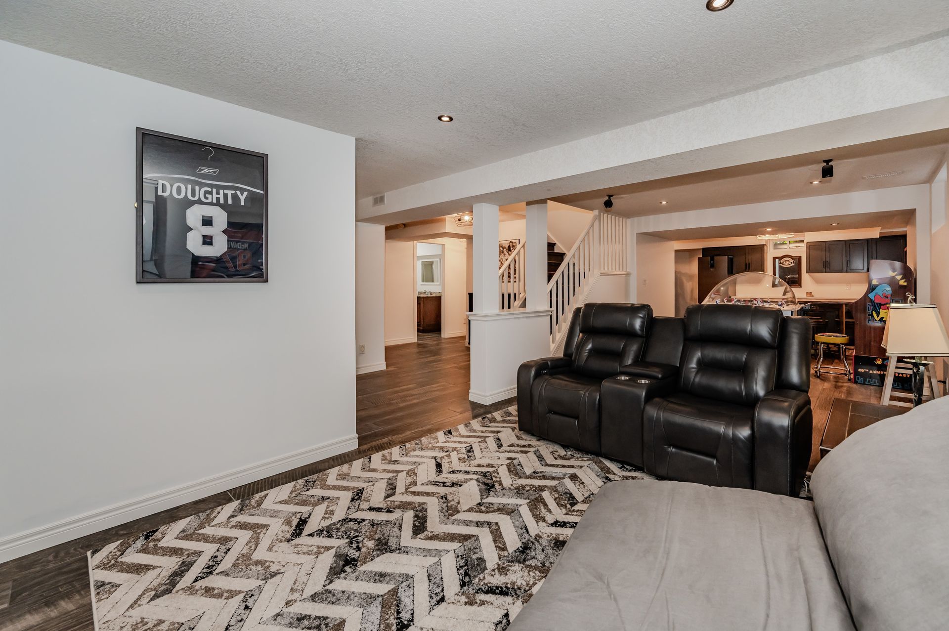 Upstairs, you will find two generously sized bedrooms and a stylish three-piece bathroom, perfect for family or guests. The luxurious primary bedroom is a retreat in itself, featuring two closets (one standard and one walk-in with custom built-ins) and a spa-like ensuite with a stunning glass and tile shower, modern vanity with dual sinks, and elegant fixtures. The fully finished basement adds to the home's versatility and entertainment options, boasting a large recreation room with custom built-ins and a gas fireplace, an impressive wet bar with full cabinetry, sink, and fridge, as well as a gym and entertainment area, a spacious bedroom, den, and a three-piece bathroom. Every detail of this home has been meticulously designed to provide comfort, luxury, and convenience.